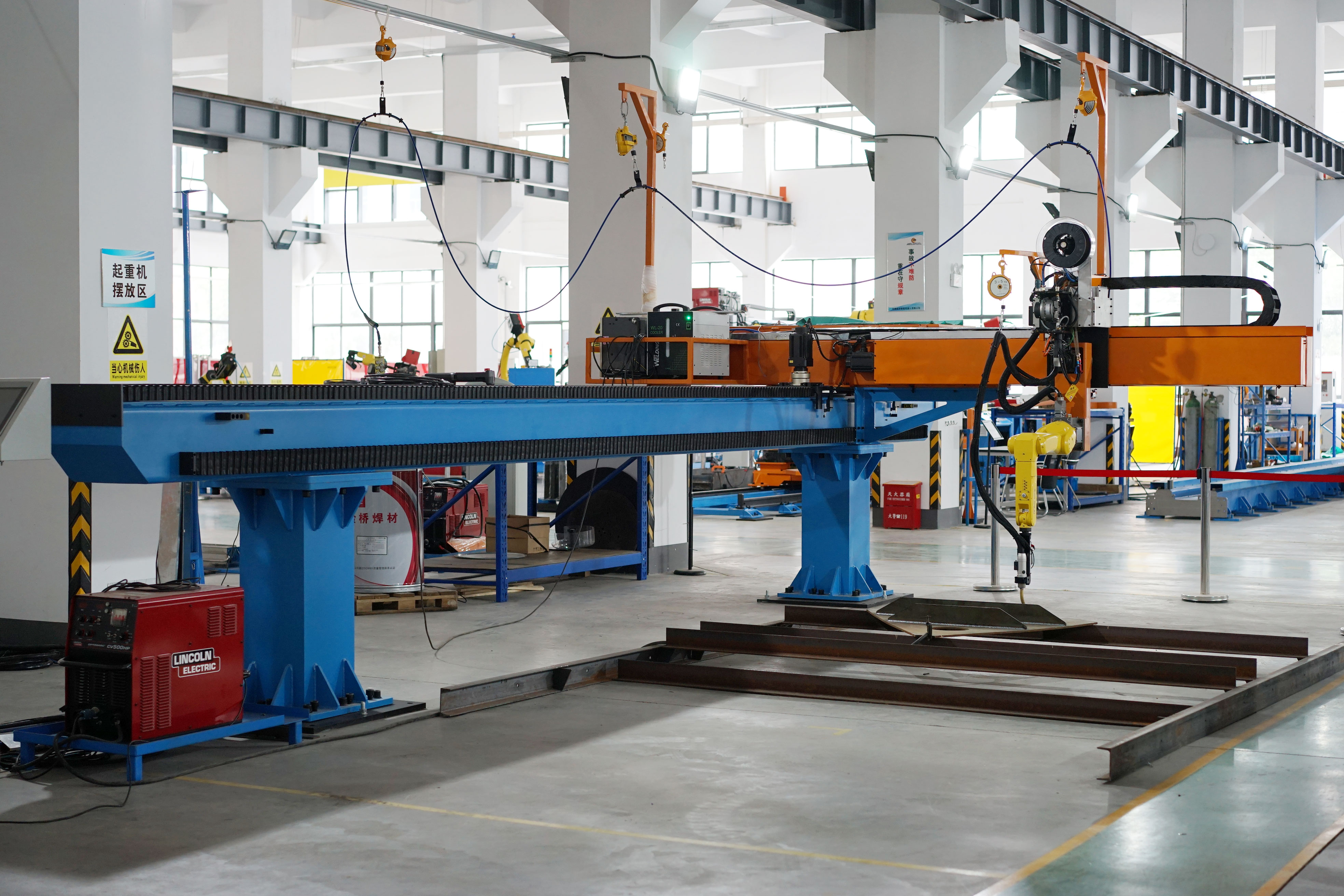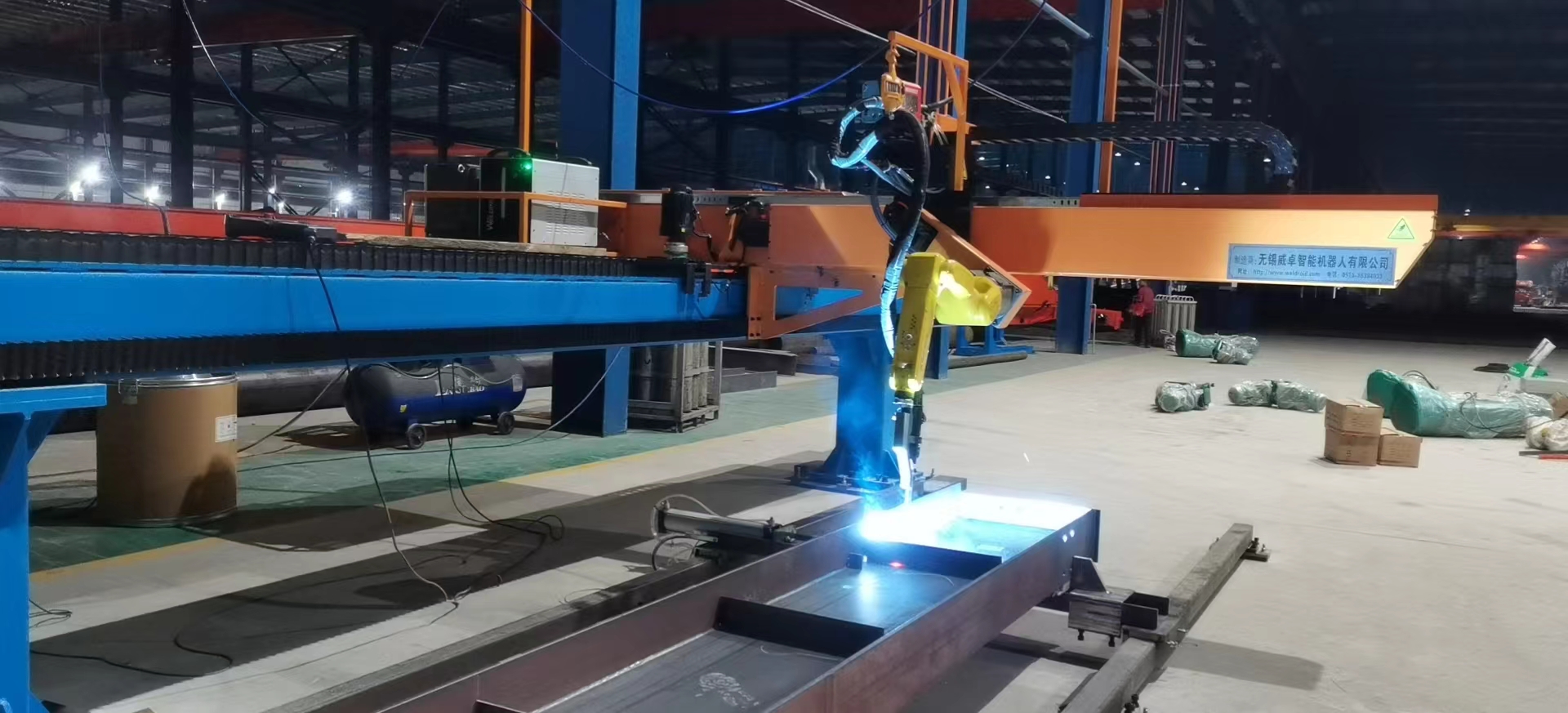 針對鋼結構中常見的H型鋼等鋼梁工件,威卓設計研發了小龍門智能焊接工作站,焊槍部分使用鋼梁專用焊槍,更適用于鋼梁焊接;搭配傳感器使用,自動尋位識別焊縫,無需人工編程出軌跡;整個工作站由威卓智能控制系統 統一控制;工件放在地上即可焊接,無需夾具。